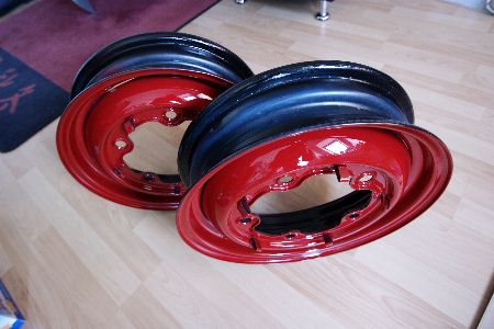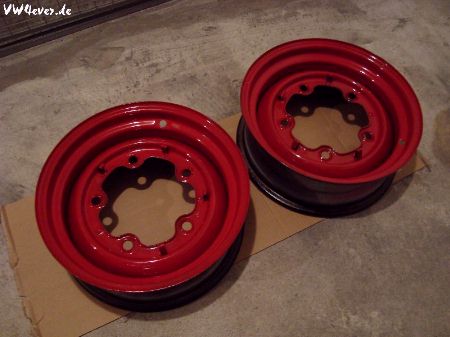 Wieder ein paar Pakete :o) Die hinteren Felgen wuchsen auf 5,5" und die vorderen schrumpften auf 3,5"! Ein Hauch von rotem Lack, breite Edelstahlzierringe für die Hinteren und schon waren sie fertig... Bei den Reifen entschied ich mich vorn für 135/70 R15 und hinten für 185/65 R15! Bilder dazu später... |
