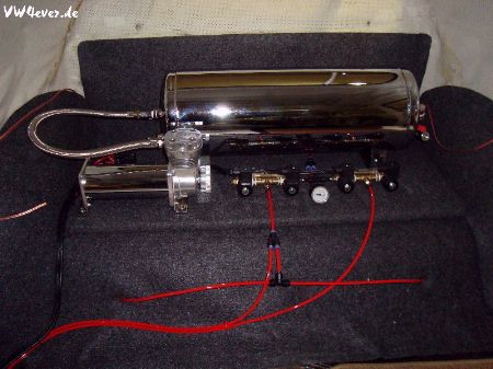Da alles möglichst original erscheinen sollte, entschied ich mich für ein Airride auf Basis von Highjackers. Das ganze System verschwand unsichtbar hinter der Rückbank. Hier ein paar Bilder von der fertigen Platte inkl. der Komponenten und Verkabelung. Da ich einen kleinen Elektrik-Fetich habe musste dies alles peinlichst sauber und übersichtlich verlegt sein ;o) |
