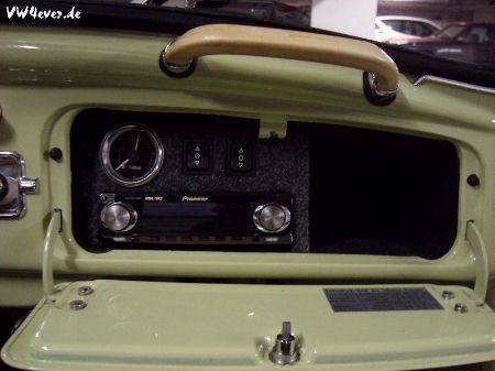 | Da ja nun endlich alle Leitungen Kabel verlegt waren konnte der neue Teppich verlegt werden, original anthrazit. Zusätzlich kam ein EMPI-Shifter mit 40% Schaltwegverkürzung dazu. Für den guten Ton baute ich eine Hutablage worin ein kleines 13er 2-Wege System sein Werk verrichtet, welches von einem kleinen aktiven 20cm Subwoofer unter der Rückbank unterstützt wird. | ![]() |