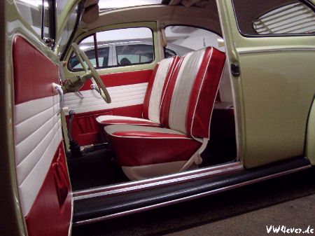 | Jetzt konnten auch die frsich restaurierten Sitze wieder rein! Ich habe alles in perlweiß lackiert und mit passenden weiß/roten Bezügen bezogen - 50th Sytle. Die Abdeckungen an der Seite habe ich von den 68er Sitzen umgearbeitet damit sie an die Neuen passen, einfach mal was anderes ;o) Details bestimmen das Leben... | ![]() |