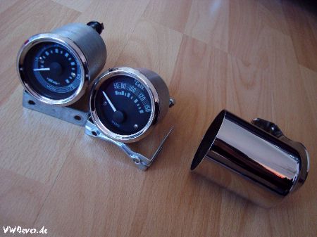 | Da ich die ersten Wochen noch ein wenig mit der Betty um die Häuser gezogen bin hielten sich die Modifikationen in Grenzen. Also erstmal ein offener K&N Filter drauf und TDE Rohre für besseren Abzug und Klang ;o) Keine Angst das hässliche orange wird noch weichen! Die 1. Teile flatterten auch schon ins Haus, umgearbeitete 52mm VDO Anzeigen im Original Käfer-Tacho-Look! | ![]() |