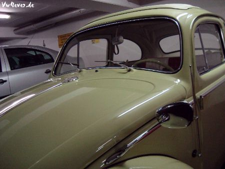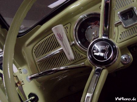 | Hier ein Bild vom Endstand des Innenraums! Die Vase wie auch das Lenkrad inkl Lenkstock wurden perlweiß lackiert. Zwei künstliche Blumen für den Dauerseinsatz, Chromzierleisten an der Frontscheibenbelüftung und eine originale Ra-Bambus Ablage verfeinerten das Gesamtbild. Nun fühlt man sich doch wesentlich wohler und freut sich auf die 1. Ausfahrt. | ![]() |