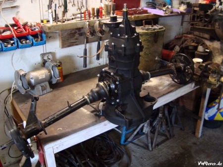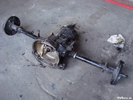| Danach fix das Getriebe raus für die weiteren nicht so einfachen Schritte. Wer schon mal Achswellen usw. von nem Pendelachsgetriebe umgebaut hat, weiß wovon ich rede ;o) | ![]() |