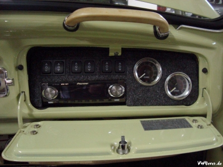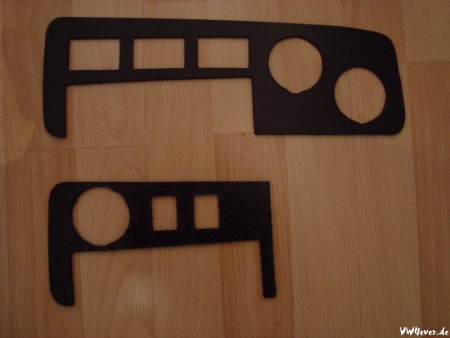 | Da ich nun zwei Druckanzeigen und sechs Schalter unterbringen musste, baute ich eine neue Konsole. Natürlich weiterhin versteckt im Handschuhfach. Wie vorher wurde sie mit grauem Nadelfilz bezogen. Letztendlich musste nur noch alles verkabelt und eingepasst werden um eine komfortable und sichere Funktion zu gewährleisten ;o) | ![]() |