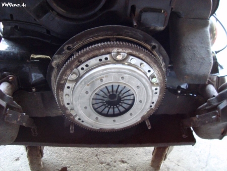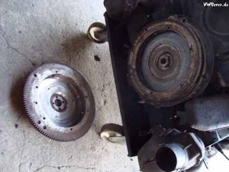 | Dann gabs die 1. Überraschung, warum ist an dem 1600er eine 180er Kupplung? :o( Also erstmal fix ne 200er Schwungscheibe besorgen um die neue naütrlich 200er Kupplung zu montieren. Dabei haben wir gleich noch den Motorsimmerring gewechselt. | ![]() |