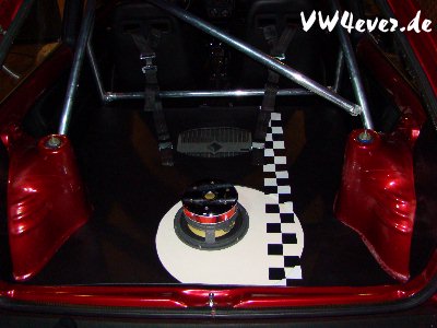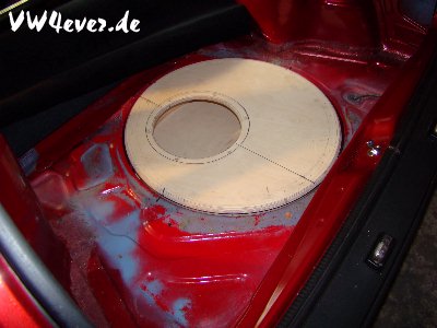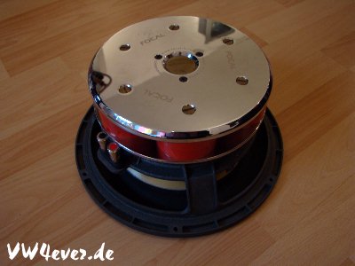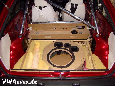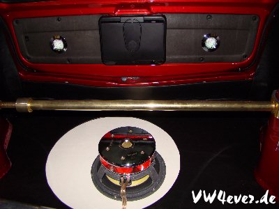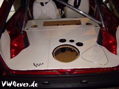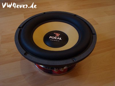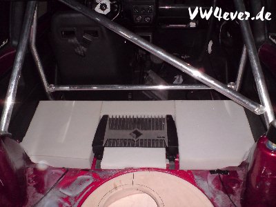 Der dezente Bass durfte natürlich nicht fehlen, diesmal wird allerdings nur vorhandener Raum genutzt! Daher lediglich die Höhe von 11cm der Radhausmulde! Optimal passend dafür ist der Focal 27KX im geschlossenen Gehäuse. Das Gehäuse besteht aus Multiplex, super stabil und wesentlich leichter wie MDF! Auf ein Hecksystem wurde diesmal komplett verzichtet... |