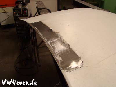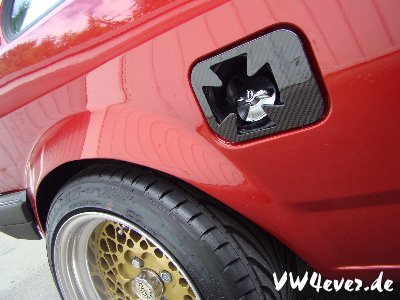 Nicht zu vergessen die Lenksäulenverkleidung, der Einarmwischer, die Tankklappe (mit extravagantem Guckloch für den verchromten Tankdeckel) über die Eigenbau-Domcaps hinten! |