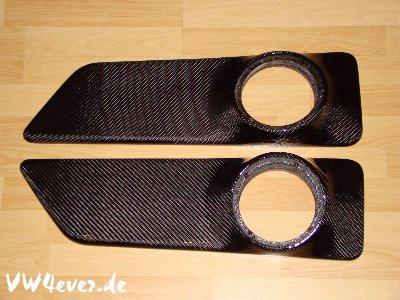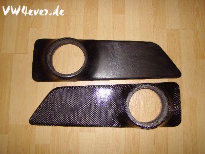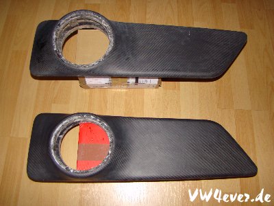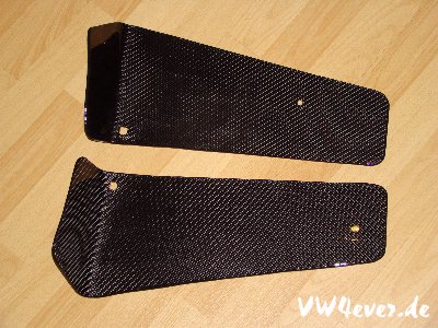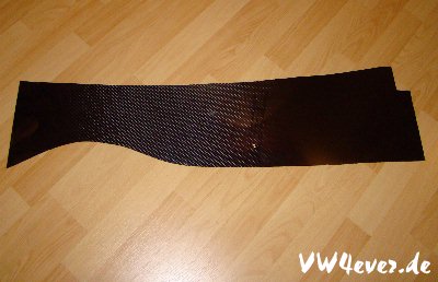 | Als ich so dabei war, hab ich mir meine Türverkleidungen nochmal angeschaut und naja irgendwie gefiel mir das schwarze Leder auf den Doorboards doch nicht so, also wurden sie kurzerhand wieder abgezogen und angefangen mit Kohlefaser zu beziehen... Hier mal ein paar Bilder über die Arbeitsschritte, vom schwarzlackierne, über die 1. Schicht Harz, bis hin zum geschliffenen und letztendlich fertigem Teil! | ![]() |