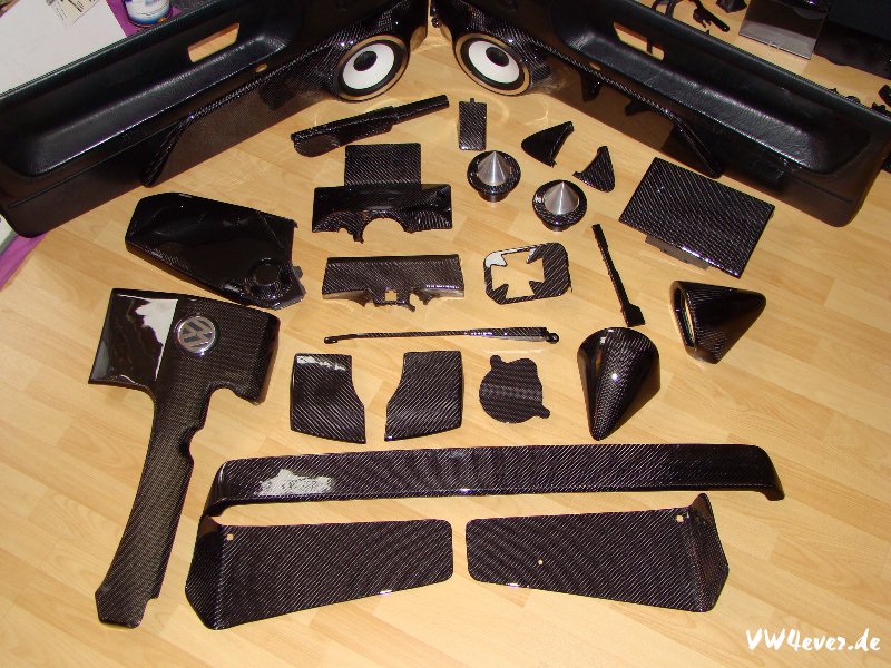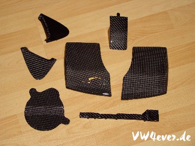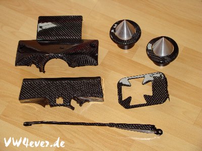 | Da KOHLE süchtig macht waren die nächsten Teile schon in Arbeit :o) Angefangen bei den Spiegeldreiecken, über die Abdeckung der Einspritzleiste, bis hin zu den Lautsprecherabdeckungen... | ![]() |