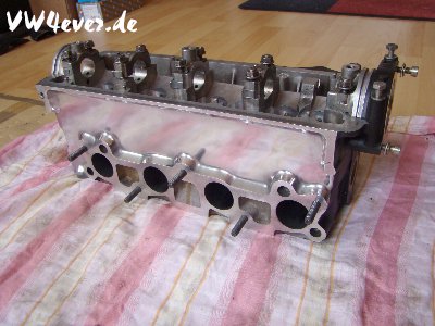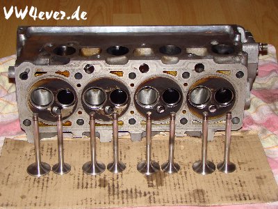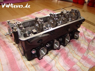 Kopf fertig überarbeitet! Ventilsitze neu gefräst, Ventile neu abgedreht und eingeschliffen und gekürzt, sowie die Abgasdichtfläche geplant... UNTEN: Bilder vom fertigen Kopf, Sichtfläche vorn poliert, der rest mattschwarz lackiert :o) |