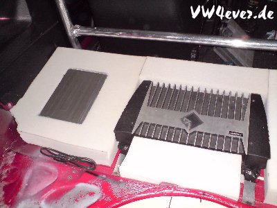 | Als nächstes widmete ich mich der Verstärkerhalterung, auch hier wie immer möglichst ohne neue Löcher zu bohren und möglichst wenig Gewicht! Zum Einsatz kommt diesmal ein guter alter Rockford Fosgate Punch 800a4! Dazu kam der alte 6er CD-Wechsler... |