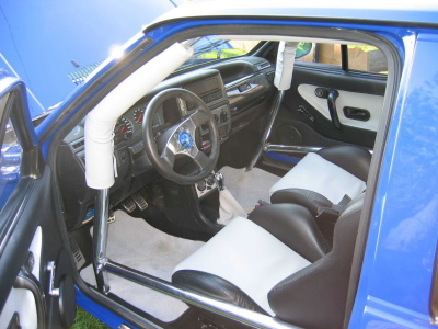 Recaro SR in Leder schwarz/ grau, Schroth-Gurte, 3-er Armaturenbrett mit blau-roter Beleuchtung, 3-er Türverkleidungen in Leder schwarz/ grau, polierter Alu-Käfig mit Kreuz und Flankenschutz, schwarzer Himmel, Zentralverriegelung mit Funk, Alarmanlage, Eigenbau Edelstehl-Fensterkurbeln, Zusatzinstrumente (Ladedruck+ Öltemperatur blau beleuchtet), TT-Pedale mit Fußstütze |