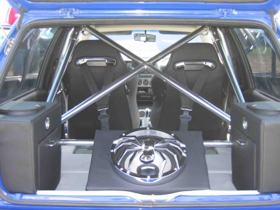 Kenwood CD-Tuner, 2x Alpine V12 Vierkanal Endstufe / Echtglas mit Glasgravur, Rodek Frontsystem, JBL Hecksystem, Design Basskiste, Kofferraumausbau Leder schwarz/grau mit Halogenbeleuchtung |