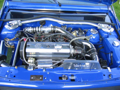 G40 Bj. 1993 mit KKK03 Turbolader, Eigenbau Krümmer, Drosselklappe RS bearbeitet, VW4ever Chip, bearbeitete Ansaugbrücke poliert, G60 Einspritzdüsen, einstellbarer Benzindruckregler, Haubenspiegel, polierte Edelstahlladedruckrohre / Wasserkühlung des Turbo, verchromter Getriebedeckel, polierter Ventildeckel |