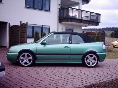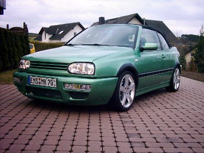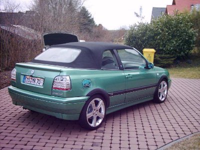 Zender RS Frontschürze mit Klarglas Nebellampen und großen Klarglasblenden als zusätzliches Standlicht (NSW kpl. nachgerüstet inkl. Kabelsatz) DE-Upgrade Scheinwerfer Klarglas Xenonlook mit Angel-Eyes Standlichtringen, Sportfrontgrill ohne VW-Emblem, Außenspiegel vom Golf 4 Cabrio (elektrisch und beheizt, blaues Glas), Glatte Heckschürze vollflächig lackiert bis unten mit vergoldeten Schrauben, LED Klarglas Rückleuchten |