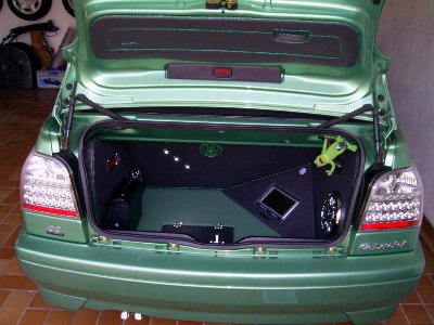 DVD Player mit 5,6 Zoll TFT in Mittelkonsole inkl. selbst angefertigtem Rahmen mit Leder bezogen und 7 Zoll TFT als Rückspiegel und Monitor für hintere Passagiere, Sound per Transmitter/Radio, Kofferraumausbau Leder Bi-Color mit TFT, Led´s, Lauflichter und Sound inkl. Audiobahn Chrom- blenden |