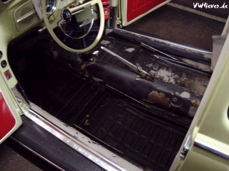 | Danach ging es dem Innenraum an den Kragen, leider waren ja Sitze vom 68er Modell verbaut wozu meine neuen Bezüge nicht passten. Außerdem sollten es schon die zum Baujahr passende Sitze sein. Also erstmal den kompletten Innenraum entkernen. Bombenzustand, nur die Teppichreste abkratzen war echt nen Akt. Egal, da muss man durch um nun die entscheidenen Schritte folgen zu lassen bevor die neue Ausstattung wieder rein durfte... | ![]() |