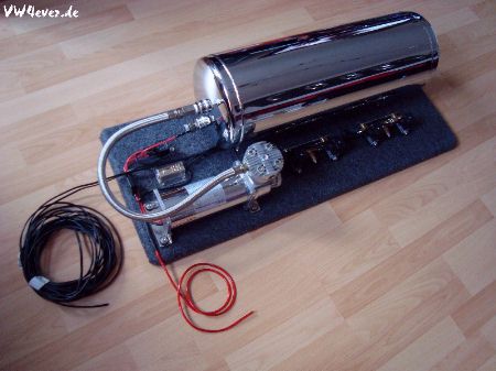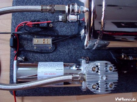 Da alles möglichst original erscheinen sollte, entschied ich mich für ein Airride auf Basis von Highjackers. Das ganze System verschwand unsichtbar hinter der Rückbank. Hier ein paar Bilder von der fertigen Platte inkl. der Komponenten und Verkabelung. Da ich einen kleinen Elektrik-Fetich habe musste dies alles peinlichst sauber und übersichtlich verlegt sein ;o) |