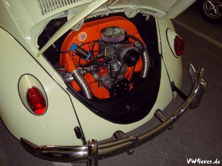 Nun musste nur noch der Motor optisch auf Vordermann gebracht werden, bei dem hässlichen Orange bekam man ja Augenkrebs! Was auch immer da den Vorbesitzer geritten hat, das musste weichen! Also erstmal alles zerlegen um die Motorverblechung auszubauen, Käfermotorschrauben ist ja wirklich wunderbar einfach :o) So sah es dann erstmal aus, ebenfalls für gut befunden... |
