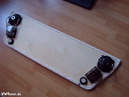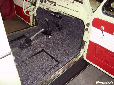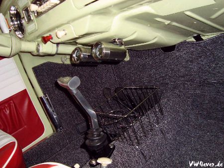 | Da ja nun endlich alle Leitungen Kabel verlegt waren konnte der neue Teppich verlegt werden, original anthrazit. Zusätzlich kam ein EMPI-Shifter mit 40% Schaltwegverkürzung dazu. Für den guten Ton baute ich eine Hutablage worin ein kleines 13er 2-Wege System sein Werk verrichtet, welches von einem kleinen aktiven 20cm Subwoofer unter der Rückbank unterstützt wird. | ![]() |