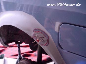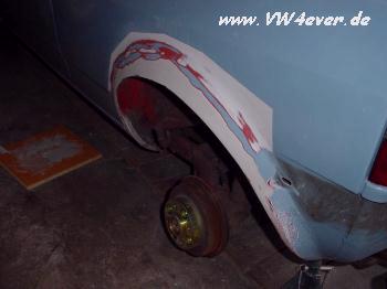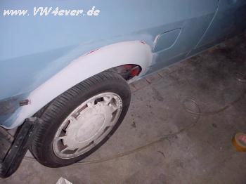 | Da der Wagen bis jetzt noch Alltag bewegt wurde (Sommer und Winter) blieben eine Blessuren natürlich nicht aus, wie z.B. ein Parkrempler im hinteren Radlauf! Da ich eh vor hatte die Radläufe zu ziehen, war dsa nicht weiter schlimm.