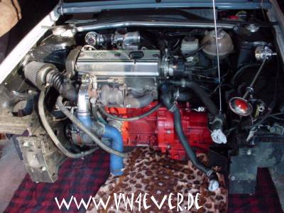| Der alte Motor flog raus, ein neuer wurde eingabut, komplett neu (auch die Kolben etc) zudem wurde das Getriebe auf Vordermann gebracht und ein KKK03 Turbolader verbaut. Leider verabschiedete sich dsa Aggregat