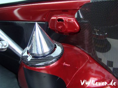Nicht zu vergessen die Lenksäulenverkleidung, der Einarmwischer, die Tankklappe (mit extravagantem Guckloch für den verchromten Tankdeckel) über die Eigenbau-Domcaps hinten! |